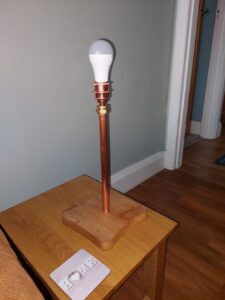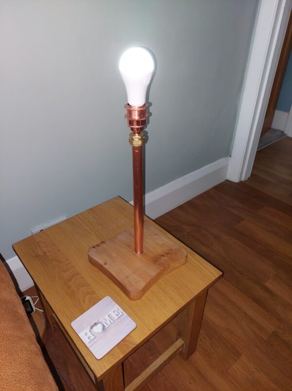 Bespoke handmade hardwood and copper table lamp using rechargeable light bulbs for convenience and flexibility to easily move to different places.